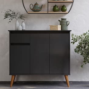 Aparador Veneza Preto O Aparador Buffet Veneza é a união perfeita entre sofisticação, praticidade e design contemporâneo. Ideal para compor salas de jantar, estar ou espaços sociais, ele oferece um visual limpo e funcional, com excelente aproveitamento interno.Com tampo em MDF usinado e estrutura firme com pés em madeira, o móvel traz um acabamento refinado que valoriza cada detalhe do ambiente. O design minimalista dispensa puxadores externos, garantindo uma estética moderna e elegante.Internamente, o aparador oferece amplo espaço para guardar objetos, utensílios e itens do dia a dia, com a praticidade de corrediças metálicas que proporcionam maior suavidade e durabilidade na abertura das portas.Dimensões:Altura: 83 cmLargura: 93 cmProfundidade: 35 cmObservações:- Sem puxadores externos: visual clean e contemporâneo- Tampo em MDF usinado com acabamento de alto padrão- Pés em madeira: estabilidade e toque natural- Corrediça metálica: abertura suave e resistente- Amplo espaço interno para organização eficiente