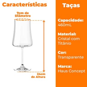 A Taça para Vinho da Haus Concept é produzida em cristal com titânio, que traz muito mais resistência, transparência e brilho se comparada com as taças convencionais de vidro. A Taça possui design moderno com 460ml de capacidade, ideal para você degustar e saborear seus vinhos.