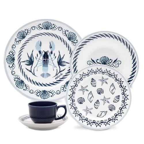 A graciosidade e delicadeza do modelo Flamingo viajam até a região litorânea da Itália e formam a mais bela combinação entre a porcelana e os elementos do mar. Conchas, estrelas do mar e a icônica lagosta no centro do prato decoram a coleção e trazem o gostinho da comida simples e cheia de sabor, feita nas osterias da região, para a mesa. Desenhado à mão em aquarela, o azul da cor do mar junto ao branco da porcelana representa uma mistura clássica que dá certo!