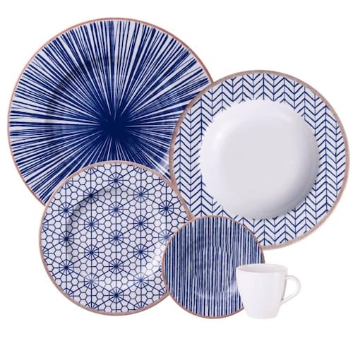 Conteúdo: 6 xícaras cappuccino 200ml; 6 pires; 6 pratos fundos 23cm; 6 pratos rasos 28cm; 6 pratos sobremesa 21 cm.