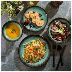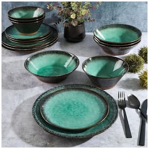 Design Artesanal e Versatilidade: Cada Item Apresenta um Acabamento de Esmalte Reativo, Criando uma Estética Única As Cores Cerceta e Cinza Suave Combinam para uma Apresentação Elegante e Contemporânea