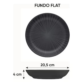 Os pratos da linha Flat possuem uma área maior de uso, sendo uma opção adequada para empratamentos criativos e proporcionam mais conforto no uso. Com formas retas e funcionais, as peças são fáceis de armazenar em armários compactos. A decoração Ônix tem acabamento acetinado na cor preta, semelhante à pedra que inspira a decoração. Linhas em alto relevo partem do centro dos pratos até as extremidades, simbolizando as ramificações presentes na pedra conhecida pela proteção e pelo afastamento de energias adversas.