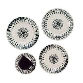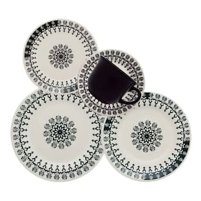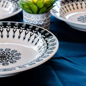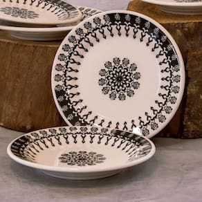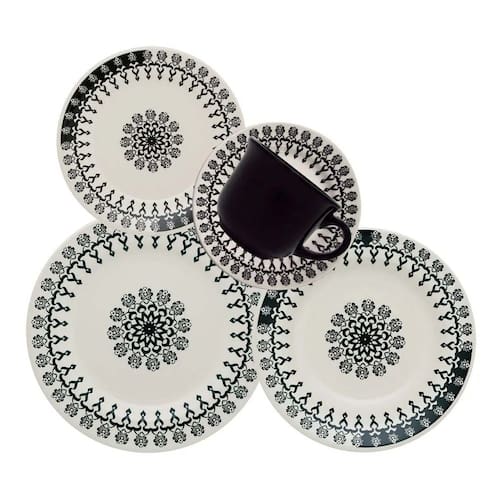 Compre agora mesmo o Aparelho de Jantar e Chá Folk, exclusiva louça preta estampada e leve elegância e alegria para sua mesa!