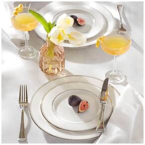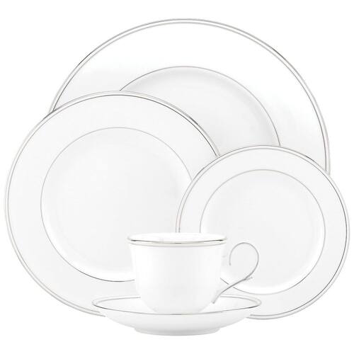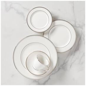 As linhas limpas e a porcelana fina do padrão Lenox Federal criam uma mesa lindamente decorada, perfeita para todas as estações. Cada peça apresenta uma base branca com três faixas de platina: a mais larga na borda e duas mais estreitas internas, finalizadas com um esmalte brilhante. Os detalhes em platina das xícaras são especialmente elegantes, contornando o pé e a borda, além de realçar as bordas laterais da alça. Este conjunto é lavável na máquina de lavar louça e resistente a lascas, garantindo praticidade e durabilidade. Importado, ele contém cinco peças no total, unindo beleza e funcionalidade para sua mesa.