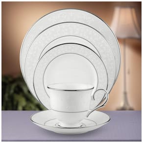 O conjunto de mesa Opal Innocence, com 5 peças, é uma escolha sofisticada e elegante para qualquer ocasião. Feito de porcelana óssea durável, apresenta um lindo design perolado com detalhes em platina, que adicionam um toque de glamour. A borda opalescente é adornada com um delicado padrão de videira em branco sobre branco, enquanto os pontos perolados, aplicados à mão, se assemelham a pequenos botões. O conjunto inclui um prato de jantar de 28 cm, um prato de salada de 21 cm, um prato de pão e manteiga de 16 cm, um pires de 15 cm e uma xícara de chá de 8 cm. A xícara e o pires têm curvas elegantes que realçam ainda mais o design. Prático, pode ser lavado na máquina de lavar louça, e os pratos de servir Opal Innocence também estão disponíveis. Fabricado nos EUA, este conjunto é resistente a lascas e ideal para criar uma mesa charmosa e intimista.