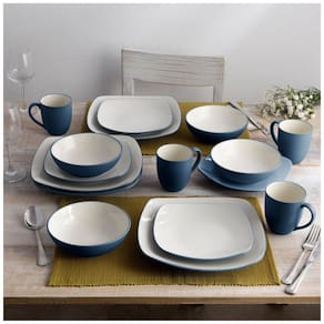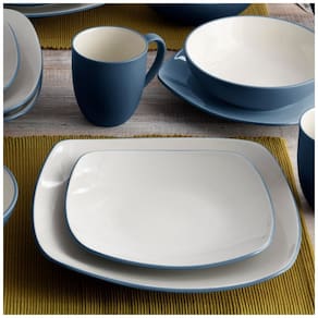 O conjunto Noritake Colorwave Blue de 16 peças serve 4 pessoas e inclui pratos de jantar quadrados, pratos de salada, tigelas e canecas, com esmalte azul fosco e interiores de creme brilhante. Este conjunto permite misturar formas e adicionar um toque de cor à sua mesa.