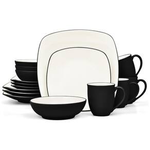 O Noritake Colorwave Graphite 16-Piece Set inclui serviço para 4 pessoas, com 4 pratos de jantar, 4 pratos de salada, 4 tigelas e 4 canecas na cor grafite fosco com interiores de creme brilhante.