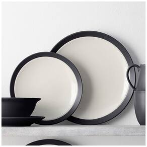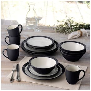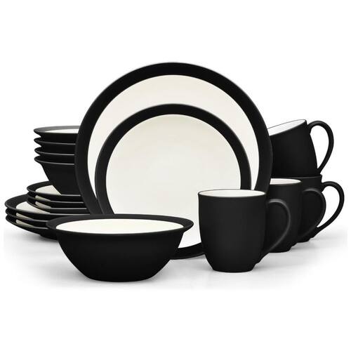O Noritake Colorwave Graphite 16-Piece Set inclui serviço para 4 pessoas, com 4 pratos de jantar, 4 pratos de salada, 4 tigelas e 4 canecas em forma de curva e cor de grafite fosco com interiores de creme brilhante.