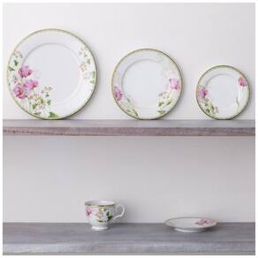 A coleção Poppy Place traz um toque de frescor e leveza para a sua mesa, evocando a sensação de um jardim florido. As papoulas rosas delicadamente combinam com uma vegetação elegante, enquanto as bordas externas apresentam chevrons em camadas, emolduradas por uma sutil borda dourada que adiciona um toque de sofisticação.