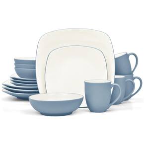 O conjunto Colorwave Ice de 16 peças da Noritake serve 4 pessoas e inclui louça quadrada na cor azul gelo fosca, com interiores em creme brilhante. O conjunto contém 4 pratos de jantar, 4 pratos de salada, 4 tigelas e 4 canecas.