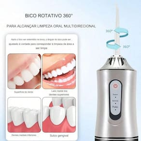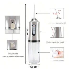 Irrigador oral de fácil manuseio, cuide da sua saúde bucal e remova resíduos de alimentos que a escova não consegue, evitando mal hálito, gengivite, placa bacterianas, cáries, entre outros problemas dentais. Seu jato de água higieniza com eficácia todos os cantos da boca, lingua e parte interna da bochecha. Regule a intensidade desejada, cada uma para uma situação específica. O jato fraco ( Weak) faz uma limpeza superficial, recomendado para remover alimentos fáceis dos dentes e lingua, o jato forte (Strong) é capaz de remover totalmente os restos de alimento, é o modo completo de limpeza, e o jato pulse, é ideal para massagem na gengiva, aliviando inflamações. Seu sorriso merece um tratamento especial com nosso irrigador oral, produto resistente, recarregável e com uma bateria super durável. Além do design leve e compacto, facilitando o transporte para qualquer lugar. ESPECIFICAÇÕES:Material: Partes externas em plástico e silicone.Tamanho: 4.5cm de diâmetro e 20 cm de altura.Voltagem : 3.7 WCapacidade do reservatório : 200ml Marca: DENTALMED
