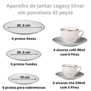 Esse conjunto conta com um design charmoso e elegante, com filetes prateados que agregam um toque de sofisticação à sua mesa. Ele é composto por 6 pratos rasos de 26,5cm, 6 pratos fundos de 20,5cm, 6 pratos para sobremesa de 19cm, 6 xícaras de café de 90ml com 6 pires e 6 xícaras de chá de 220ml com 6 pires.