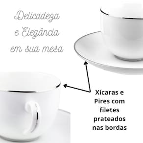 Esse conjunto conta com um design charmoso e elegante, com filetes prateados que agregam um toque de sofisticação à sua mesa. Ele é composto por 6 pratos rasos de 26,5cm, 6 pratos fundos de 20,5cm, 6 pratos para sobremesa de 19cm, 6 xícaras de café de 90ml com 6 pires e 6 xícaras de chá de 220ml com 6 pires.