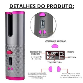 Aparelho Modelador Ondulador de Cachos Automático Portátil Cor: Cinza com Roxo O modelador de cachos que apresentamos é tudo o que você precisa para ter cabelos incríveis em qualquer lugar. Com seu carregamento bivolt, você pode usar em qualquer lugar do mundo sem preocupações. Além disso, sua função de bateria sem fio permite que você use sem precisar se preocupar com a falta de tomada.