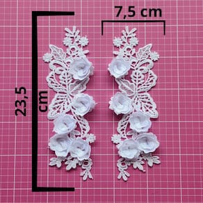 Aplique Guipir APK10 3D - Par Peça delicada e sofisticada para dar acabamento especial em vestidos, véus, roupas infantis, noivas e artesanato. Material: renda guipir de alta qualidade Formato: par direito e esquerdo Cor: branco Tamanho: 23,5 cm Ideal para personalizar peças com charme e elegância. Marca: Não Informado Ean: 7892021951170