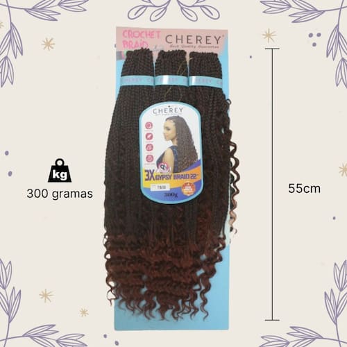 Aplique Gypsy 3x Cabelo Boho Box 300gr Crochet BraidSurpreenda-se com o novo GYPSY 3x boho box Braid sintético, cabelo macio com uma textura suave e duradoura, possui 55 cm de comprimento, fácil de aplicar no método crochet Braid com 300g de alta qualidade, durabilidade e resistência, em um visual moderno em uma mistura exclusiva de tranças e cachos em seu comprimento, e as pontas onduladas.Recomendamos de 1 a 2 pacotes para a cabeça toda.Recomendações de uso:-Utilizar água fria- Não aceita fontes de calor- Deixar secar naturalmente