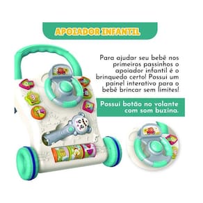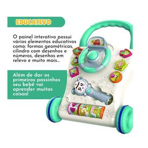 Estimula seu bebê a dar os primeiros passinhos; A frente tem atividades educativas para ensinar e divertir: pianinho, Lousa Mágica, espelho e muito mais, são 8 brinquedos para se divertir; Pode ser utilizado por bebês que já se sentam para brincar. Depois pode ser utilizado para bebês que já ficam em pé. Coordenação motora mãos, dedos, braços e pernas. Cores vibrantes, música, luzes e texturas chamam a atenção do bebê a ajudam a desenvolver os sentidos.