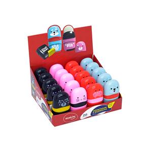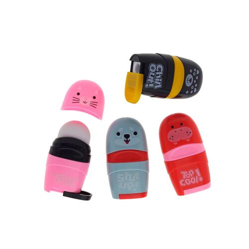 2x1 - Apontador com depósito, para lápis normal e borracha em formato divertido.