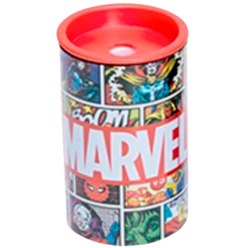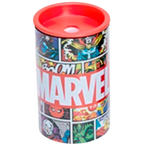 Apontador com depósito metálico com estampa dos Vingadores que inspiram o poder do trabalho em equipe, combinando suas habilidades únicas para enfrentar as ameaças que eles não poderiam enfrentar sozinhos.