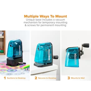 Afiador de lápis manual multimontagem Bostitch Office, suporte a vácuo ou parafuso, azul (MPS2-BLUE) - A base 2 em 1 permite montagem temporária (base a vácuo) ou montagem permanente (parafusos) - Cortador de aço pesado em um suporte fundido sob pressão para desempenho duradouro do cortador - A caixa de aparas de grandes dimensões pode ser facilmente removida para descarte rápido de resíduos - A lixeira translúcida e grande pode ser facilmente removida para desperdício rápido descarte — Alça ergonômica infantil para uso confortável — ótimo apontador de lápis para crianças