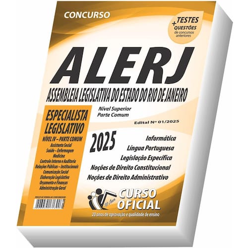 Edição impressa atualizada - elaborada por professores especializados em concursos públicos do curso oficial - são 25 anos de experiência e aprovação dedicados a você, . Cargos: especialista legislativo iv - assistente social - saúde - enfermagem - medicina - controle interno e auditoria - relações públicas - institucionais - comunicação social - elaboração legislativa - orçamento e finanças - administração geral Tipo: impressa Páginas: 310 Escolaridade: nível superior Órgão: alerj - assembleia legislativa do estado do rio de janeiro - edital nº 01/2025 Conteúdo do material: Informática Língua portuguesa Legislação específica Noções de direito administrativo Noções de direito constitucional parte comum a todos os cargos Você receberá ainda: Testes, provas e questões de concursos anteriores; Atualizações, se houver alguma mudança no edital; Prova do último concurso; Edital do concurso. Marca: Não Informado