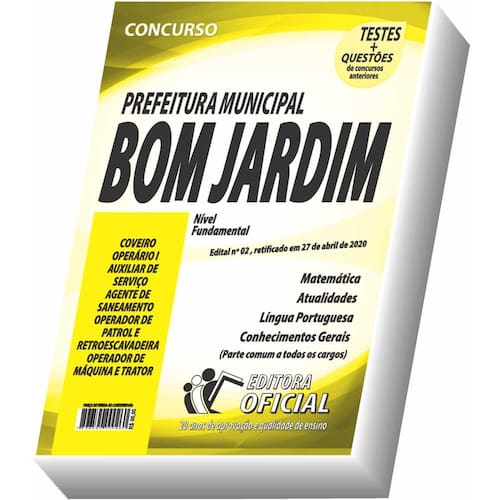 Edição impressa atualizada - elaborada por professores especializados em concursos públicos do curso oficial - são 20 anos de experiência e aprovação dedicados a você, . Cargos: coveiro - operário i - auxiliar de serviço - agente de saneamento - operador de patrol e retroescavadeira - operador de máquina e trator Tipo: impressa Páginas: 200 Escolaridade: ensino fundamental incompleto Órgão: prefeitura municipal de bom jardim - mg - edital nº 02/2020 Conteúdo do material: Matemática Atualidades Língua portuguesa Conhecimentos gerais Você receberá ainda: Testes, provas e questões de concursos anteriores; Atualizações, se houver alguma mudança no edital; Prova do último concurso; Edital do concurso Ean: 7898682123635