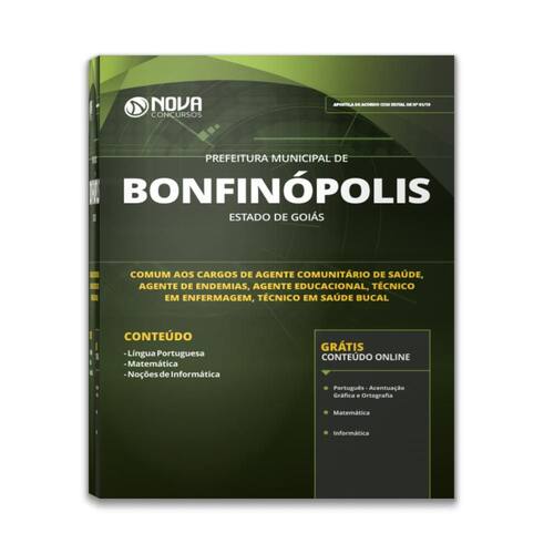 Itens que você receberá: Uma Apostila Impressa Prefeitura de Bonfinópolis GO 2019 Comum aos Cargos de Nível Médio; Um Curso Online de Português Acentuação Gráfica e Ortografia; Um Curso Online de Matemática; Um Curso Online de Informática.