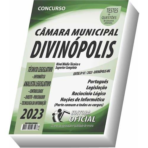 Cargo: TÉCNICO LEGISLATIVO – INFORMÁTICA - ANALISTA LEGISLATIVO – CONTABILIDADE – DIREITO - PROCURADOR – TECNOLOGIA DA INFORMAÇÃO Tipo: IMPRESSA Páginas: 320 Escolaridade: Ensino Médio Técnico e Superior Completo Órgão: CÂMARA MUNICIPAL DE DIVINÓPOLIS/MG - EDITAL Nº 01/2023