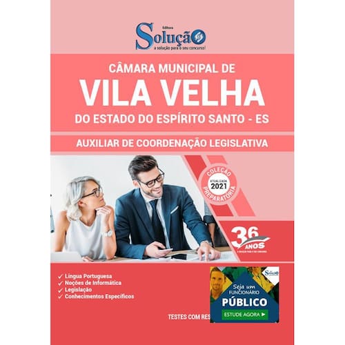 A Apostila Concurso Câmara de Vila Velha - ES 2021 - Auxiliar de Coordenação Legislativa contempla as seguintes matérias: Língua Portuguesa Noções de Informática Legislação Conhecimentos Específicos