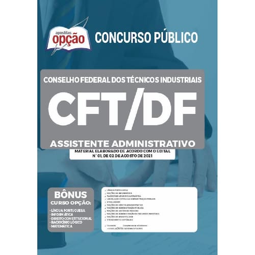 A Apostila Concurso CFT-DF 2021 - Assistente Administrativo contempla as seguintes matérias: