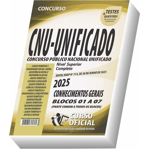 Edição impressa atualizada - elaborada por professores especializados em concursos públicos do curso oficial - são 25 anos de experiência e aprovação dedicados a você, . Cargos: bloco temático 1 - seguridade social: saúde, assistência social e previdência social - bloco temático 2 - cultura e educação - bloco temático 3 - ciência e tecnologia - bloco temático 4 - engenharia e arquitetura - bloco temático 5 - administração - bloco temático 6 - desenvolvimento socioeconômico - bloco temático 7 - justiça e defesa Tipo: impressa Páginas: 204 Escolaridade: nível superior Órgão: concurso público nacional unificado ii - governo federal - edital enap nº 114, de 30 de junho de 2025 Conteúdo do material: Conhecimentos gerais parte comum a todos os cargos Você receberá ainda: Testes, provas e questões de concursos anteriores. Marca: Não Informado Ean: 7908831304560