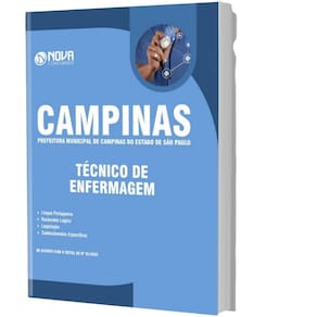 Apostila Concurso Campinas SP Técnico em Enfermagem Apostila para Concurso Prefeitura de Campinas - SP 2022 para o cargo de Técnico em Enfermagem -002ma-22-prefeitura-campinas-tec-enf-imp Concurso da Prefeitura de Campinas Características do Produto - Formato: Impressa Papel A4 - Marca: Nova Concursos - Autor: Professores Especializados - Modelo: Livro Brochura - Medidas 21x29cm - Quantidade de Páginas: 234 - Edição: Maio/2022 A Apostila Concurso Prefeitura de Campinas - SP 2022 - Técnico em Enfermagem contempla as seguintes matérias: Língua Portuguesa Raciocínio Lógico Legislação Conhecimentos Específicos 234 Páginas Ean: 7908428802066