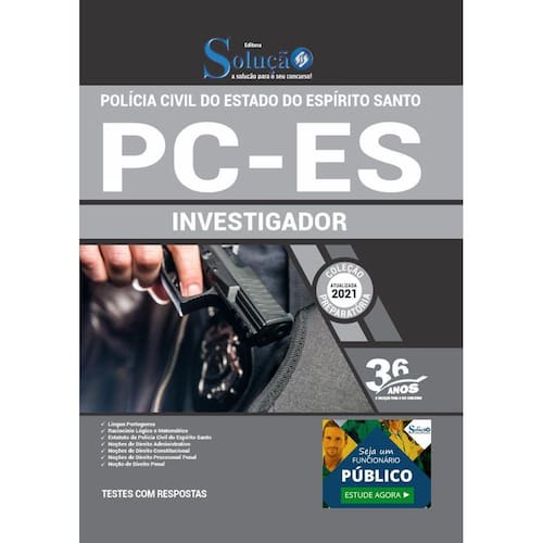 Apostila Concurso PC ES - Investigador Apostila para Concurso PC-ES 2021 para o cargo de Investigador Características do Produto - Formato: Impressa Papel A4 - Marca: Editora Solução- Autor: Professores Especializados- Modelo: Livro Brochura - Medidas 21x29cm- Quantidade de Páginas: 428- Ano de Publicação: 2021 A Apostila Concurso PC-ES 2021 - Investigador contempla as seguintes matérias:Língua PortuguesaRaciocínio Lógico e Matemático;Estatuto da Polícia Civil do Espírito SantoNoções de Direito AdministrativoNoções de Direito ConstitucionalNoções de Direito Processual PenalNoções de Direito Penal 428 Páginas Marca: Editora Solucao