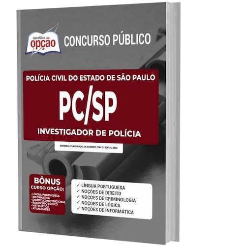 Apostila Concurso PC SP - Investigador de Polícia Apostila para Concurso PC-SP 2022 para o cargo de Investigador de Polícia Concurso da Polícia Civil De Características do Produto - Formato: Impressa Papel A4 - Marca: Apostilas Opção - Autor: Professores Especializados - Modelo: Livro Brochura - Medidas 21x29cm - Quantidade de Páginas: 482 - Ano de Publicação: 2022 A Apostila Concurso PC-SP 2022 - Investigador de Polícia contempla as seguintes matérias: Língua Portuguesa Noções de Direito Noções de Criminologia Noções de Lógica Noções de Informática 482 Páginas