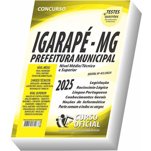 Edição impressa atualizada - elaborada por professores especializados em concursos públicos do curso oficial - são 25 anos de experiência e aprovação dedicados a você, . Cargos: nível médio - fiscal fazendário - fiscal sanitário - técnico em administração - cargos técnicos: edificações - enfermagem - laboratório - raios-x - saúde bucal - segurança do trabalho - nível superior - analista ambiental - analista do controle interno - arquiteto - bioquímico - contador - enfermeiro - engenheiro - farmacêutico - fiscal sanitário - fisioterapeuta - fonoaudiólogo - nutricionista - odontólogo - psicólogo - terapeuta ocupacional Tipo: impressa Páginas: 280 Escolaridade: nível médio, técnico e superior Órgão: prefeitura municipal de igarapé-mg - edital nº 01/2025 Conteúdo do material: Legislação Raciocínio lógico Língua portuguesa Noções de informática Conhecimentos gerais parte comum a todos os cargos Você receberá ainda: Testes, provas e questões de concursos anteriores; Atualizações, se houver alguma mudança no edital; Prova do último concurso; Edital do concurso. Marca: Não Informado