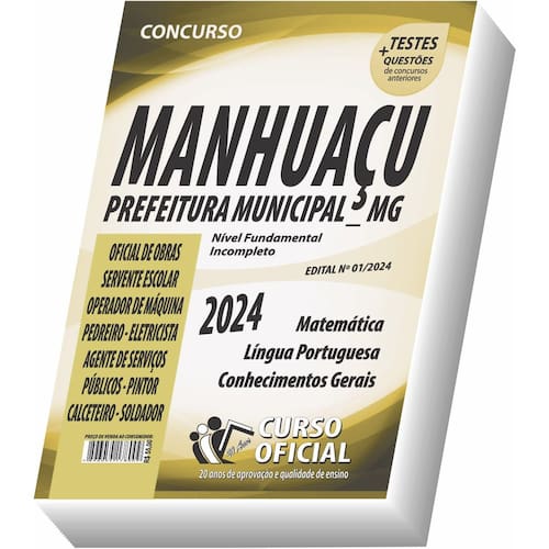 Cargo: oficial de obras - servente escolar - operador de máquina - pedreiro - eletricista - agente de serviços públicos - pintor - calceteiro - soldador Tipo: impressa Páginas: 200 Escolaridade: nível fundamental incompleto Órgão: prefeitura municipal de manhuaçu - mg - edital nº 01/2024