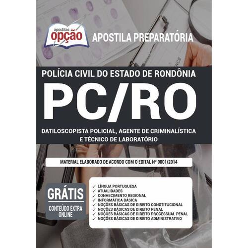 Apostila PC RO Datiloscopista Policial Agente Criminalística Apostila para Concurso PC-RO 2021 para o cargo de Datiloscopista Policial, Agente de Criminalística e Técnico de Laboratório Características do Produto - Formato: Impressa Papel A4 - Marca: Apostilas Opção- Autor: Professores Especializados- Modelo: Livro Brochura - Medidas 21x29cm- Quantidade de Páginas: 712- Ano de Publicação: 2021 A Apostila Concurso PC-RO 2021 - Datiloscopista Policial, Agente de Criminalística e Técnico de Laboratório contempla as seguintes matérias:Língua PortuguesaAtualidadesConhecimento RegionalInformática BásicaNoções Básicas de Direito ConstitucionalNoções Básicas de Direito PenalNoções Básicas de Direito Processual PenalNoções Básicas de Direito Administrativo 712 Páginas