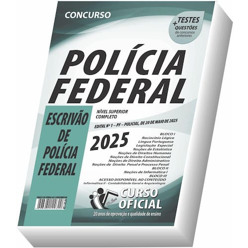 Edição impressa atualizada - elaborada por professores especializados em concursos públicos do curso oficial - são 25 anos de experiência e aprovação dedicados a você, . Cargo: escrivão de polícia federal Tipo: impressa Páginas: 450 Escolaridade: nível superior Órgão: departamento de polícia federal - ministério da justiça e segurançã pública - edital nº 1 - pf - policial, de 20 de maio de 2025 Conteúdo do material: Bloco i Língua portuguesa Raciocínio lógico Noções de direito administrativo Noções de direito constitucional Noções de direito penal Direito processual penal Direitos humanos Legislação especial Estatística Bloco ii Noções de informática Acesso ao bloco iii Noções de informática ii Noções de contabilidade geral / noções de arquivologia Você receberá ainda: Testes, provas e questões de concursos anteriores. Marca: Não Informado