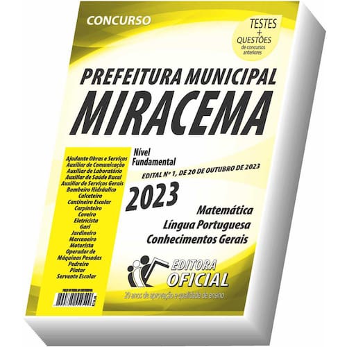 Cargos: Ajudante de Obras e Serviços - Auxiliar de Comunicação - Auxiliar de Laboratório - Auxiliar de Saúde Bucal - Auxiliar de Serviços Gerais - Bombeiro Hidráulico - Calceteiro - Cantineiro Escolar - Carpinteiro - Coveiro - Eletricista - Gari - Jardineiro - Marceneiro - Motorista - Operador de Máquinas Pesadas - Pedreiro - Pintor - Servente Escolar Tipo: IMPRESSA Páginas: 200 Escolaridade: NÍVEL FUNDAMENTAL COMPLETO E INCOMPLETO Órgão: PREFEITURA MUNICIPAL DE MIRACEMA - RJ - EDITAL Nº 1, DE 20 DE OUTUBRO DE 2023
