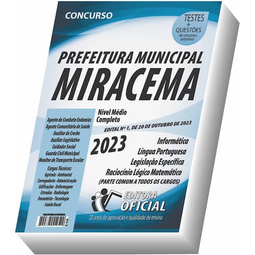 Cargos: Agente de Combate Endemias - Agente Comunitário de Saúde - Auxiliar de Creche - Auxiliar Legislativo - Cuidador Social - Guarda Civil Municipal - Monitor de Transporte Escolar - Cargos Técnicos: Agrícola - Ambiental - Corregedoria - Administração - Edificações - Enfermagem - Estradas - Radiologia - Desenhista - Tecnologia - Saúde Bucal Tipo: IMPRESSA Páginas: 200 Escolaridade: NÍVEL MÉDIO E TÉCNICO Órgão: PREFEITURA MUNICIPAL DE MIRACEMA - RJ - EDITAL Nº 1, DE 20 DE OUTUBRO DE 2023