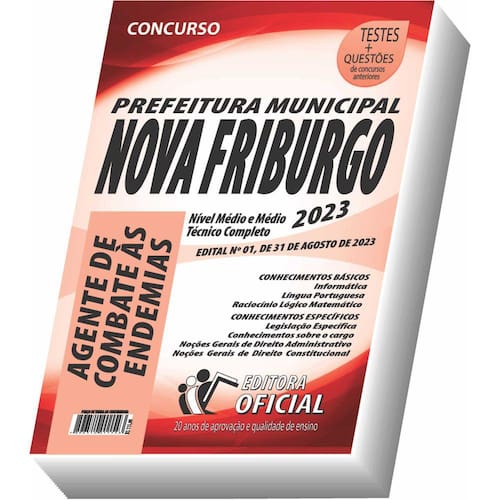 Cargo: Agente de Combate às Endemias Tipo: IMPRESSA Páginas: 420 Escolaridade: NÍVEL MÉDIO E MÉDIO TÉCNICO Órgão: PREFEITURA MUNICIPAL DE NOVA FRIBURGO/RJ - EDITAL Nº 01, DE 31 DE AGOSTO DE 2023