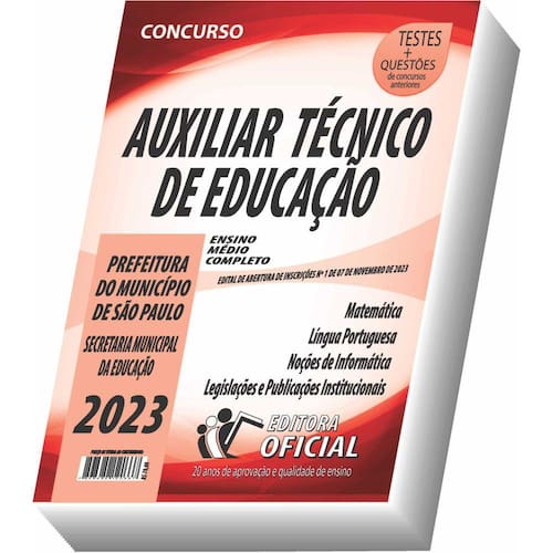 Cargo: AUXILIAR TÉCNICO DE EDUCAÇÃO Tipo: IMPRESSA Páginas: 284 Escolaridade: NÍVEL MÉDIO Órgão: PREFEITURA DO MUNICÍPIO DE SÃO PAULO - SECRETARIA MUNICIPAL DA EDUCAÇÃO - Edital de Seleção Pública SME/NÚC_ADM-PUBL Nº 092942324