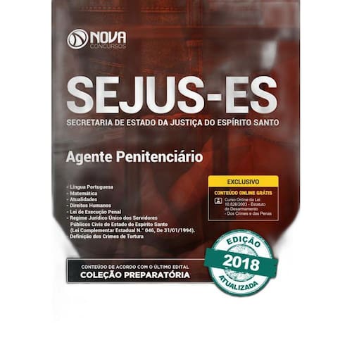 Esta é a Loja Oficial da Solução Cursos e Concursos Apostila para Concurso SEJUS - ES 2018 para o cargo de Agente Penitenciário Características do Produto - Formato: Impressa - Quantidade de Páginas: 346 - Ano de Publicação: 2018 Veja mais informações da Apostila SEJUS - ES 2018 A Apostila para o Concurso SEJUS - ES 2018 - Agente Penitenciário contempla as seguintes matérias: - Língua Portuguesa, - Matemática, - Atualidades, - Direitos Humanos, - Lei de Execução Penal, - Regime Jurídico Único dos Servidores Públicos Civis do Estado do Espírito Santo Lei Complementar Estadual Nº 046, de 31/01/1994 , - Definição dos Crimes de Tortura. Total de 346 Páginas. - Está incluso com a Apostila: Um Curso Online da Lei 10.826/2003 - Estatuto do Desarmamento - Dos Crimes e das Penas A Apostila para Agente Penitenciário do concurso SEJUS - ES 2018 foi rigorosamente elaborada conforme o último edital publicado, o que torna o seu conteúdo completo e atualizado. O conteúdo da Apostila e distribuído de forma interativa e simplificada, justamente para facilitar os seus estudos. A apostila contém testes com respostas de todas as matérias, isso lhe ajudará na fixação do conteúdo, pois segundo especialistas, o estudo torna-se mais eficaz quando conciliamos teoria e resolução de exercícios. Não Perca tempo, compre a sua Apostila SEJUS - ES 2018 - Agente Penitenciário, a sua Aprovação é a nossa Satisfação