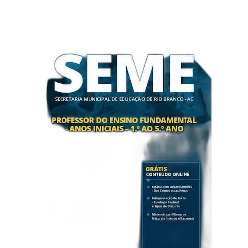 A Apostila Concurso SEME Rio Branco - AC 2019 - Professor de Ensino Fundamental - Anos Iniciais 1º ao 5º Ano Contempla as seguintes matérias: