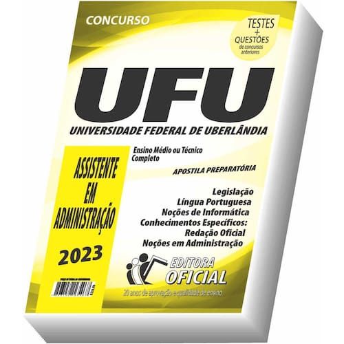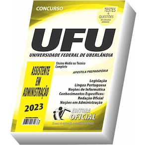 Edição Impressa Atualizada – Elaborada por professores especializados em concursos Públicos do Curso Oficial – São 23 anos de experiência e aprovação dedicados a você, candidato.Cargo: ASSISTENTE EM ADMINISTRAÇÃOTipo: IMPRESSAPáginas: 198Escolaridade: ENSINO MÉDIO OU TÉCNICO COMPLETOÓrgão: SERVIÇO PÚBLICO FEDERAL - MINISTÉRIO DA EDUCAÇÃO - UNIVERSIDADE FEDERAL DE UBERLÂNDIAConteúdo do Material:LegislaçãoLíngua PortuguesaNoções de InformáticaConhecimentos EspecíficosRedação OficialNoções em AdministraçãoVOCÊ RECEBERÁ AINDA:Testes, provas e questões de concursos anteriores;Atualizações, se houver alguma mudança no edital;Prova do último concurso;Edital do Concurso.