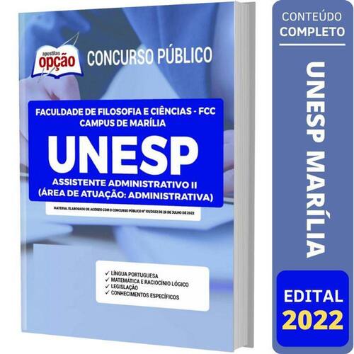 A Apostila para Assistente Administrativo II Área de Atuação: Administrativa do concurso UNESP Campus Marília 2022 foi rigorosamente elaborada conforme o edital, o que torna o seu conteúdo completo e atualizado.