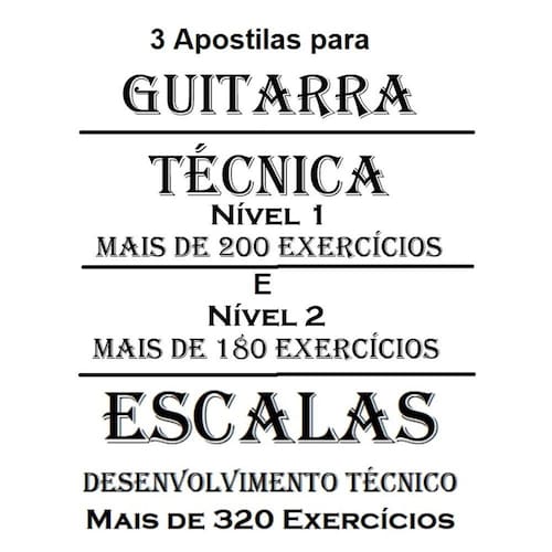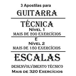 Apostila Estudos em Escalas para Violão e Guitarra - 100 páginas de muito conteúdo - Indicado para todos os níveis - Mais de 320 exercícios Apostila Guitarra Técnica Nível 1 - Estudos para o desenvolvimento - A Apostila contém mais de 200 exercícios sendo os temas distribuídos em 50 páginas Apostila para Guitarra - Estudos de técnica nível 2 - Impressa e encadernada com 54 páginas - Mais de 180 exercícios de vários temas