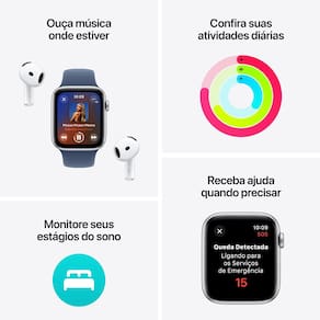 -Por que Apple Watch Se — Todos os recursos essenciais para você se movimentar, manter a conexão, monitorar sua saúde e ficar em segurança. O watchOS 11 oferece mais inteligência, opções de personalização e conectividade. Com Detecção de Queda* e métricas de treino aprimoradas, o Apple Watch SE é cheio de possibilidades ao alcance do seu pulso**; -Conexão Celular — Envie mensagens, atenda ligações, ouça músicas e podcasts, use a Siri ou peça ajuda com o SOS de Emergência***. O Apple Watch SE (GPS) usa seu iPhone ou Wi-Fi para manter você sempre em conexão; -Recursos de saúde e segurança — Receba informações detalhadas sobre sua saúde, como alertas em caso de ritmo cardíaco irregular**** ou de frequência cardíaca muito alta ou muito baixa****. Consiga ajuda na hora em que precisar com a Detecção de Queda**, Detecção de Acidente e SOS de Emergência****. Avise outras pessoas de forma automática quando você chegar bem ao seu destino com o recurso Chegou Bem*****; -Compatibilidade total — O relógio funciona de forma integrada com seus outros aparelhos e serviços Apple****** Desbloqueie seu Mac automaticamente. Localize seus aparelhos com facilidade. Faça pagamentos com o Apple Pay; -Ideal para nadar cheio de estilo — Resistente à água até 50 metros*******. Três cores incríveis. Com a parte de trás da caixa na mesma cor e feita por meio de um novo processo de produção que reduz as emissões de carbono; -Fácil de personalizar — Com pulseiras em diferentes estilos, materiais e cores, além de mostradores personalizáveis, é fácil combinar com seu humor ou com o momento; -Ótimo parceiro de treinos — O app Exercício oferece diversas maneiras de treinar e métricas avançadas com informações sobre seu desempenho. Além de tudo isso, o Apple Watch vem com três meses de Apple Fitness+ grátis********; -Neutro em carbono — O Apple Watch SE (2ª geração) é neutro em carbono quando combinado com algumas pulseiras. Saiba mais sobre o compromisso da Apple com o meio ambiente em apple.com/br/2030; -Possui Teclado Virtual; -Possui recurso viva-voz; -Idiomas: Alemão, árabe, catalão, chinês (simplificado, tradicional, tradicional de Hong Kong), coreano, croata, dinamarquês, eslovaco, espanhol (América Latina, Espanha, México), finlandês, francês (Canadá, França), grego, hebraico, hindi, holandês, húngaro, indonésio, inglês (Austrália, EUA, Reino Unido), italiano, japonês, malaio, norueguês, polonês, português (Brasil, Portugal), romeno, russo, sueco, tailandês, tcheco, turco, ucraniano, vietnamita.Sistema operacional