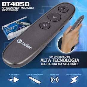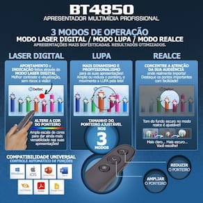 Esse é o mais novo e tecnológico Apresentador Multimídia Wireless, agora você terá uma experiência de apresentação muito superior, como nunca antes! Possui 3 opções modos de ponteiros: realce, com ele você poderá realçar determinado objeto na tela, lupa, no qual ampliará e laser digital, semelhante ao tradicional, porém muito mais seguro pois ele é eletrônico, onde poderá escolher a cor e em todos eles poderá configurar o seu tamanho. Você conta também com várias outras funções como clique, tela cheia, página acima, página abaixo, alarme anti-perda, alternar janelas, alarme com display e vibração, aviso de bateria fraca entre outros. Possui bateria interna e acompanha um software para configuração personalizadas dos modos dos ponteiros, velocidade, alarme e outras configurações.