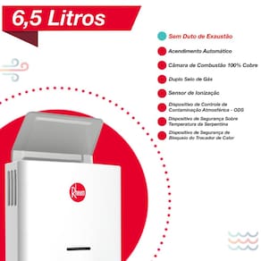 O aquecedor Rheem 6,5 litros foi desenvolvido com tecnologia que dispensa o uso de duto de exaustão, permitindo instalação sem chaminé, ideal para ambientes sem exaustão externa. Equipado com sensor de segurança atmosférica (ODS), monitora o ambiente e interrompe o funcionamento em condições inadequadas.